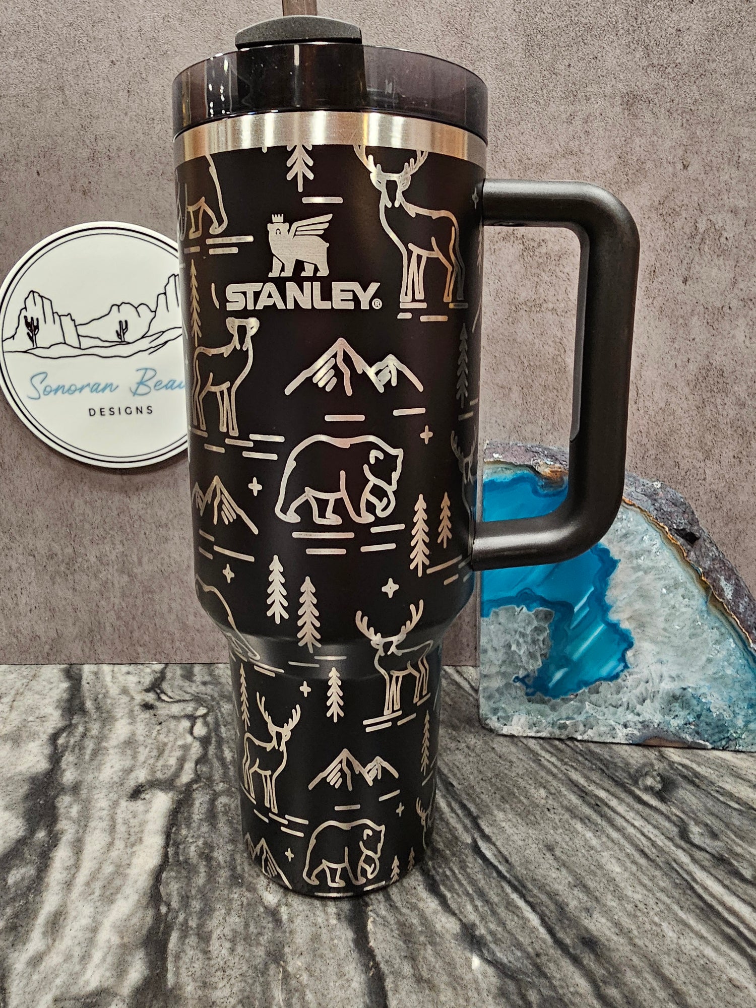 Sonoran Beauty Original, a classic outdoor lovers design featuring trees, mountains, bears and stags. Looks great on all size and brand tumblers.