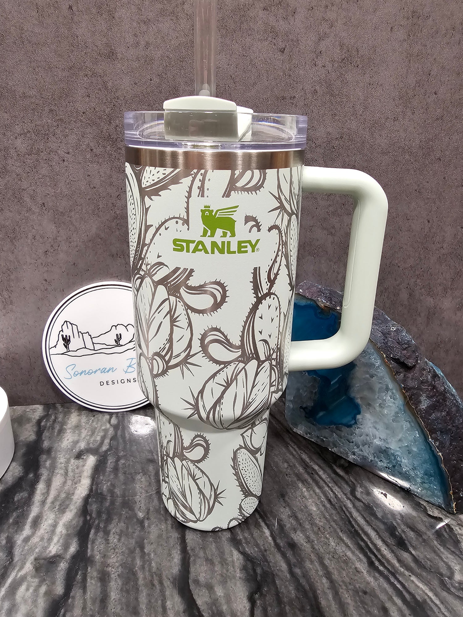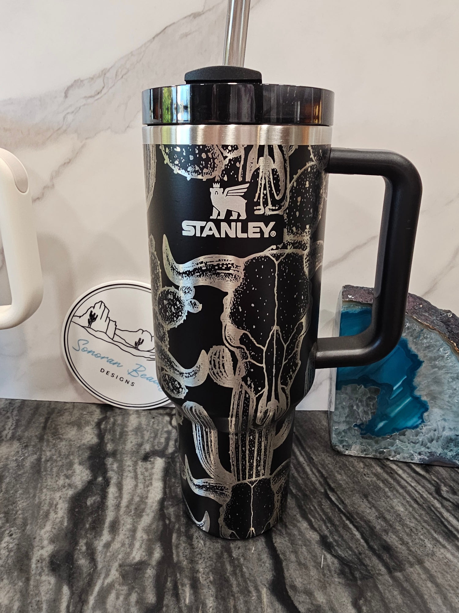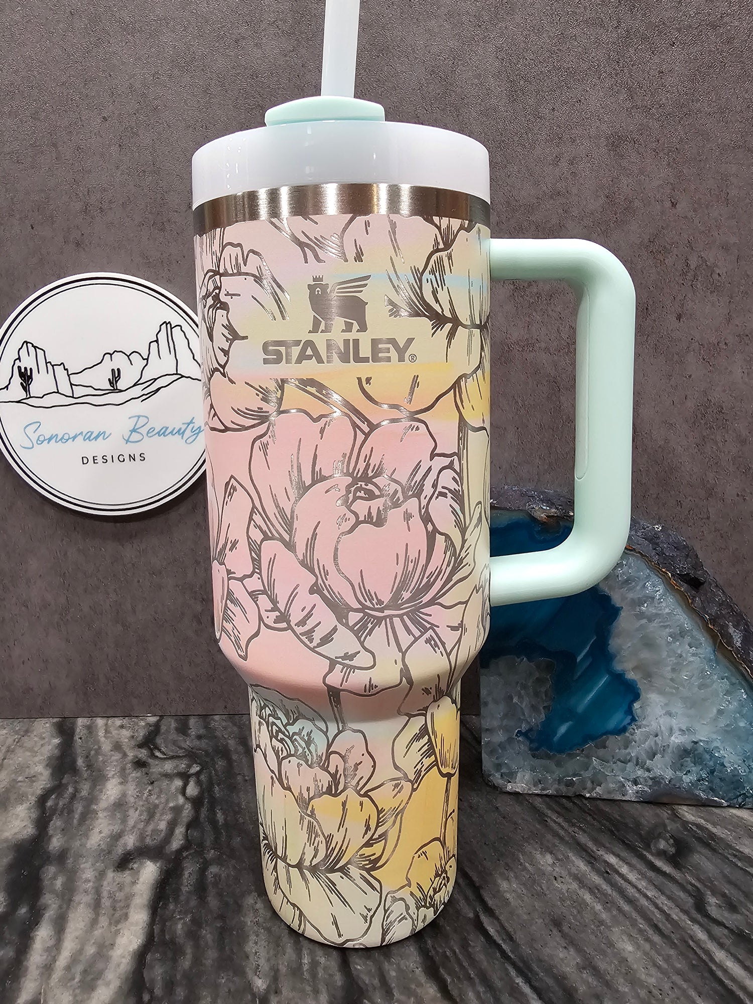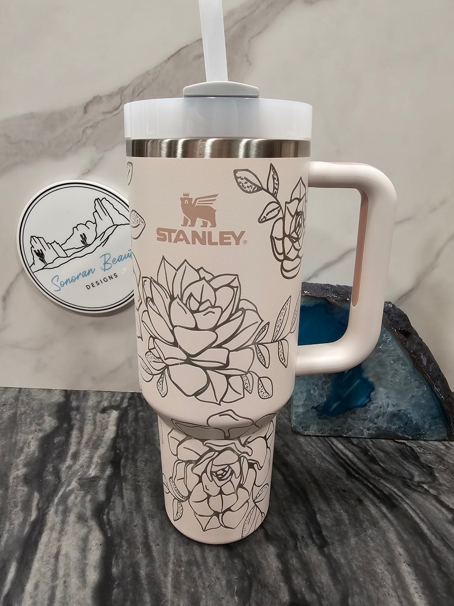 The first design by Amanda at Sonoran Beauty Designs. Originally designed for the Cream colored Stanley, it features a full wrap design with clusters of succulents and flowers. The blank spaces emphasize the design elements and draw attention to the color and beauty of the cup itself. This cup embodies the natural and neutral designer vibes that are popular right now.