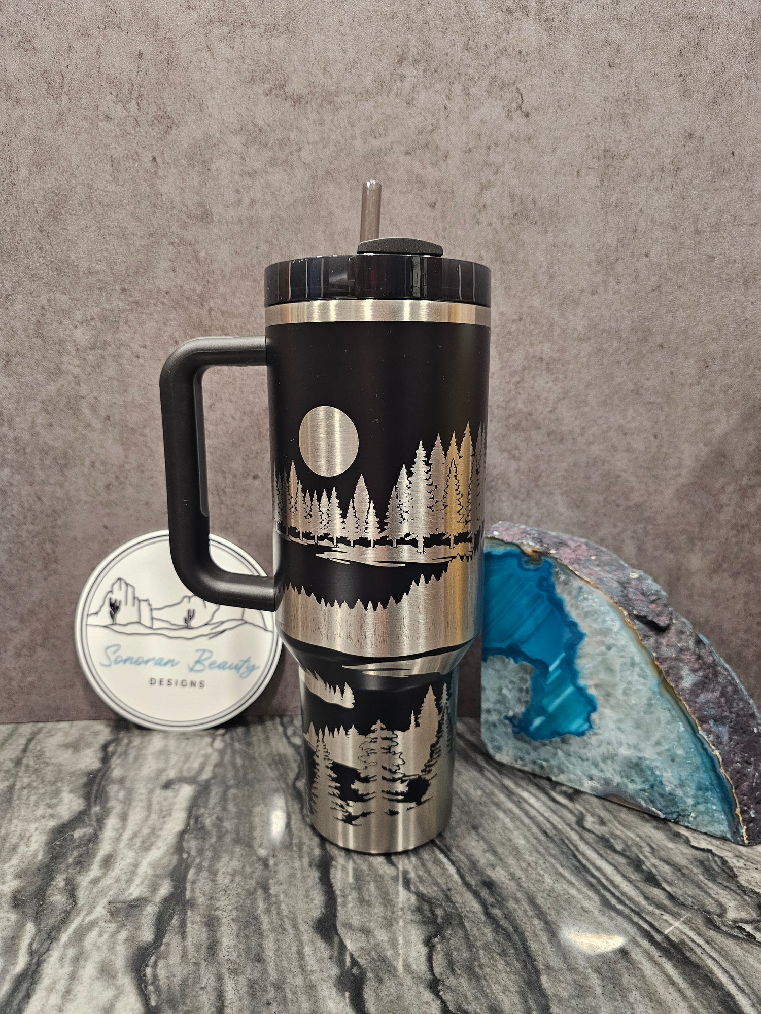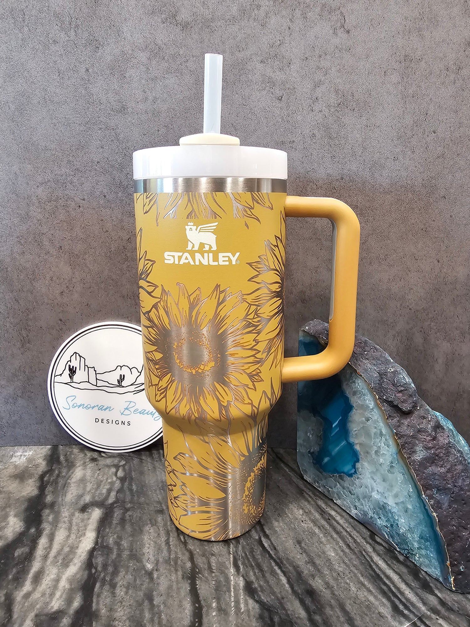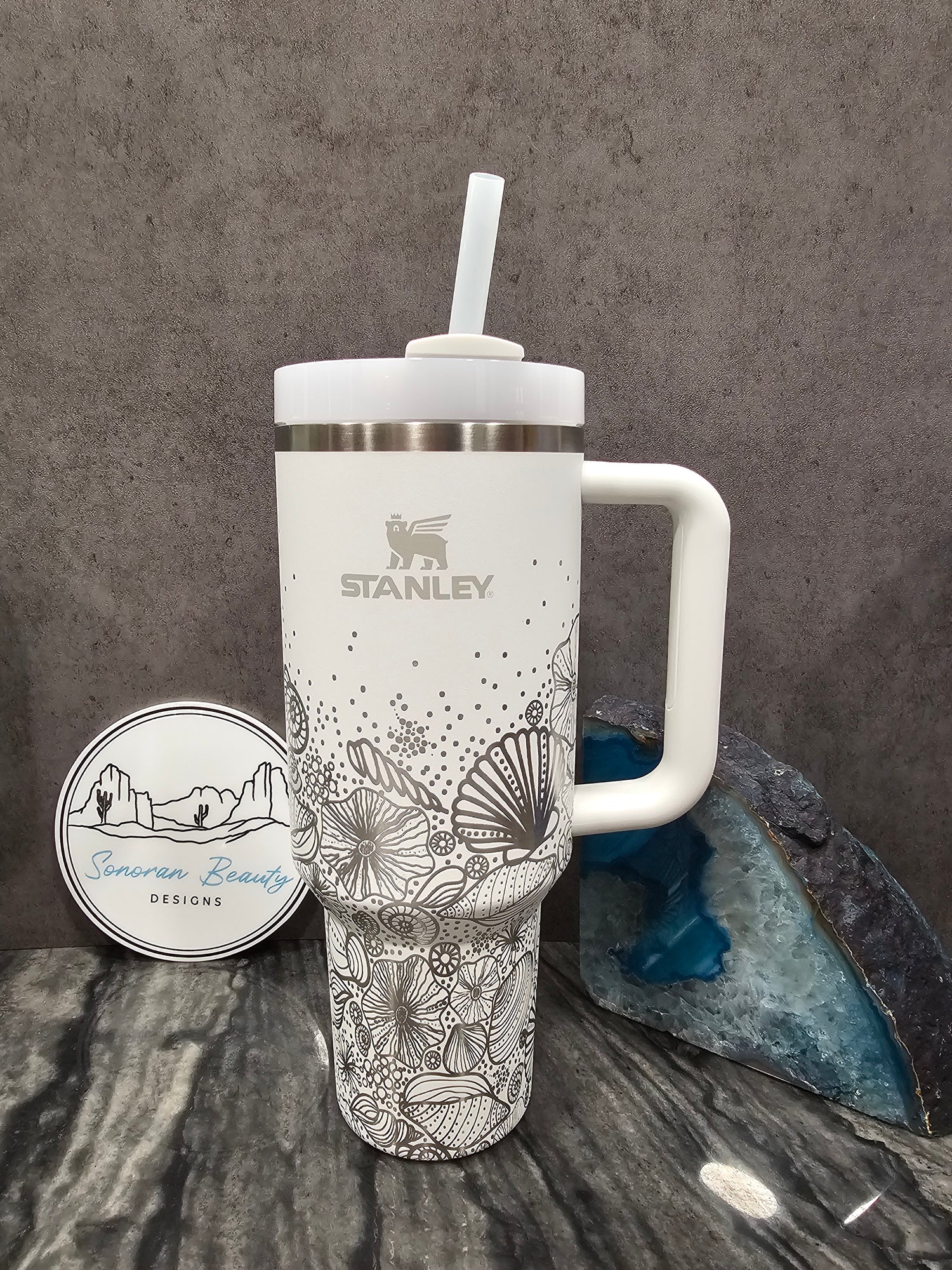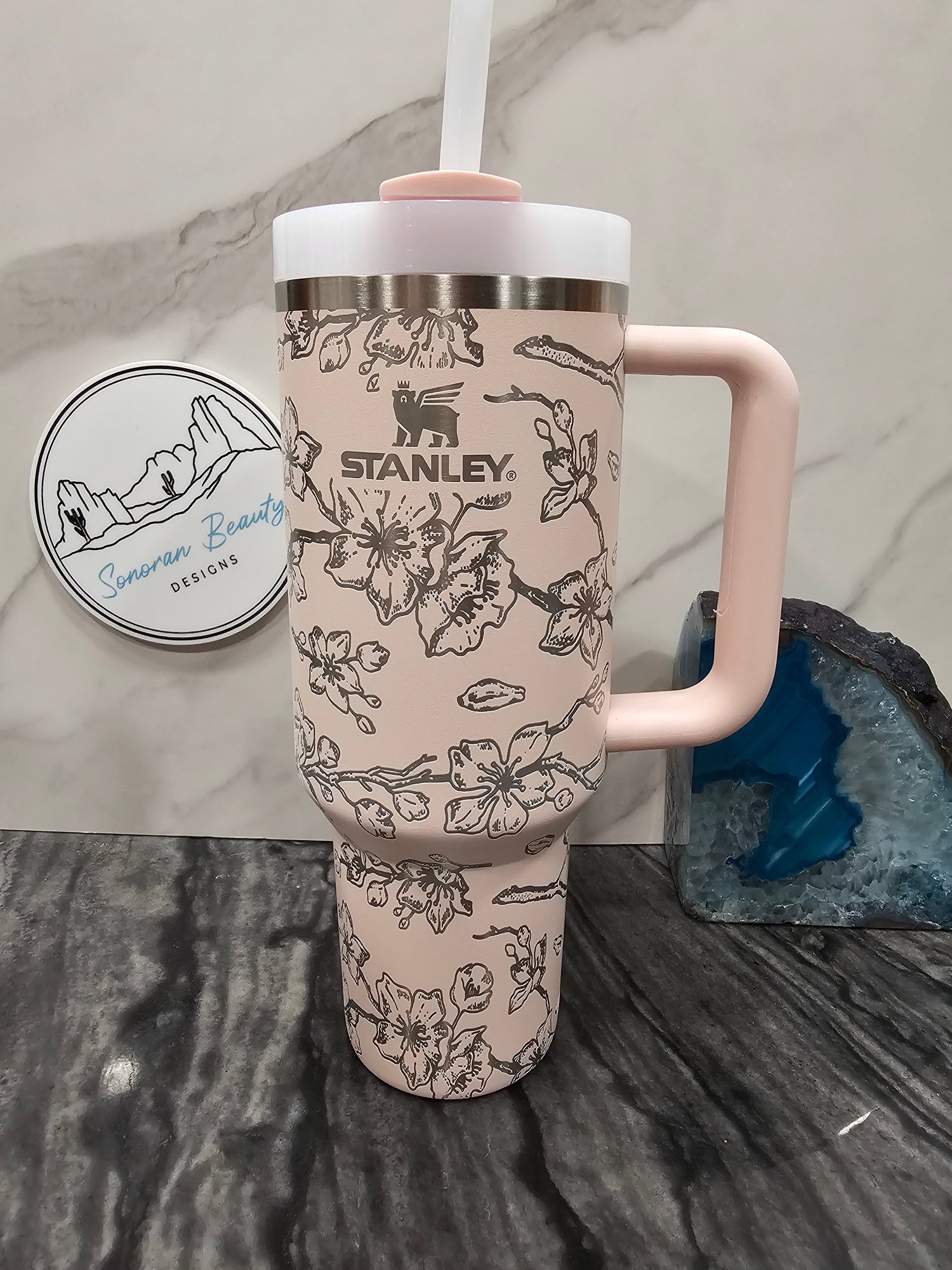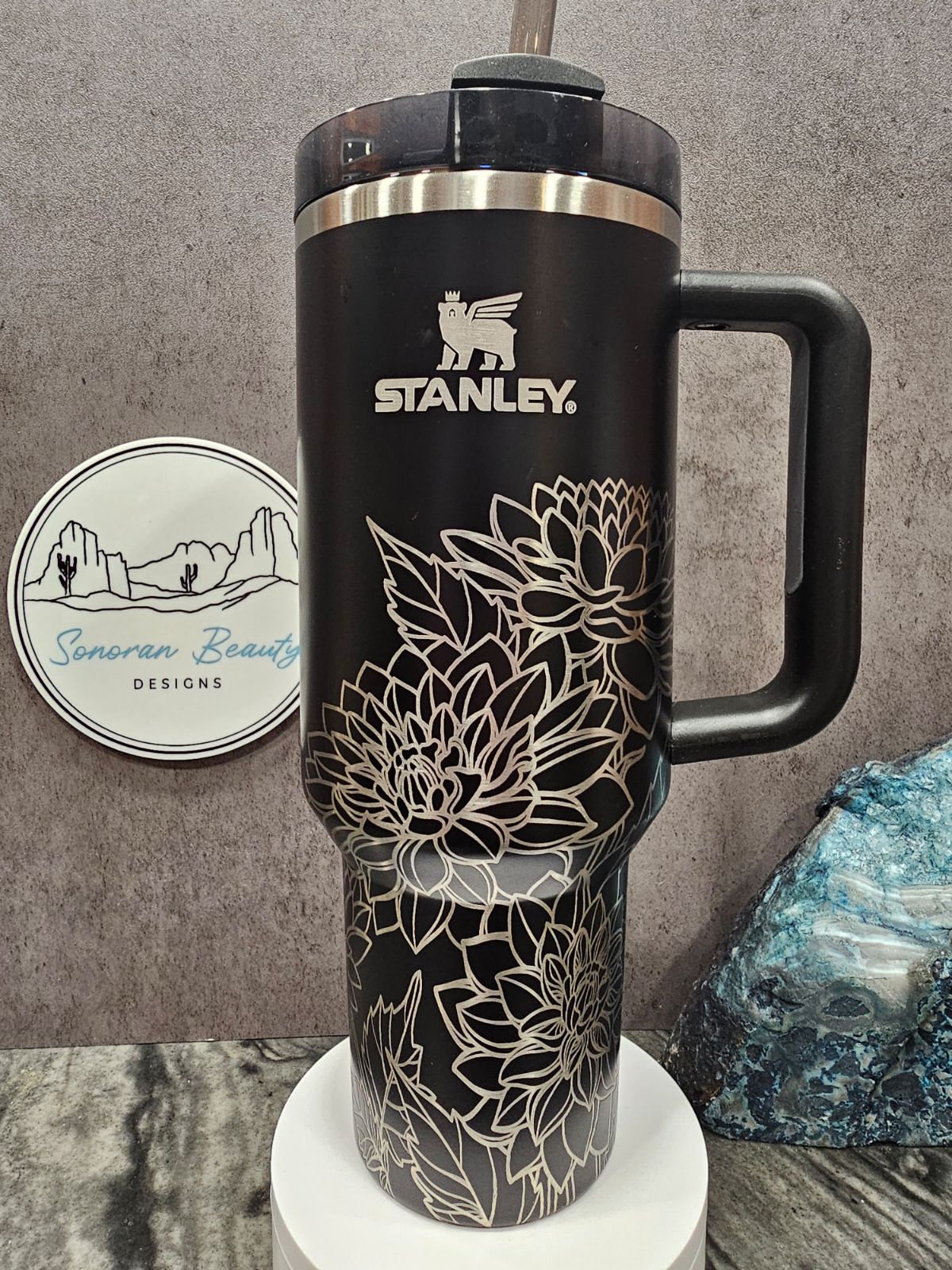 The first design by Amanda at Sonoran Beauty Designs. Originally designed for the Cream colored Stanley, it features a full wrap design with clusters of succulents and flowers. The blank spaces emphasize the design elements and draw attention to the color and beauty of the cup itself. This cup embodies the natural and neutral designer vibes that are popular right now.