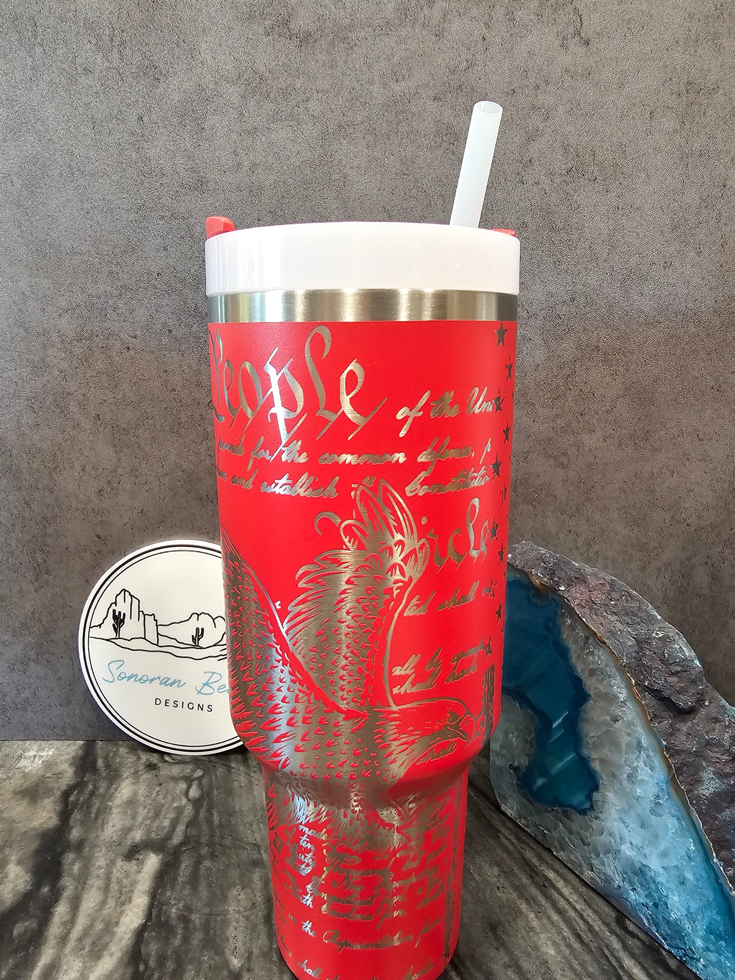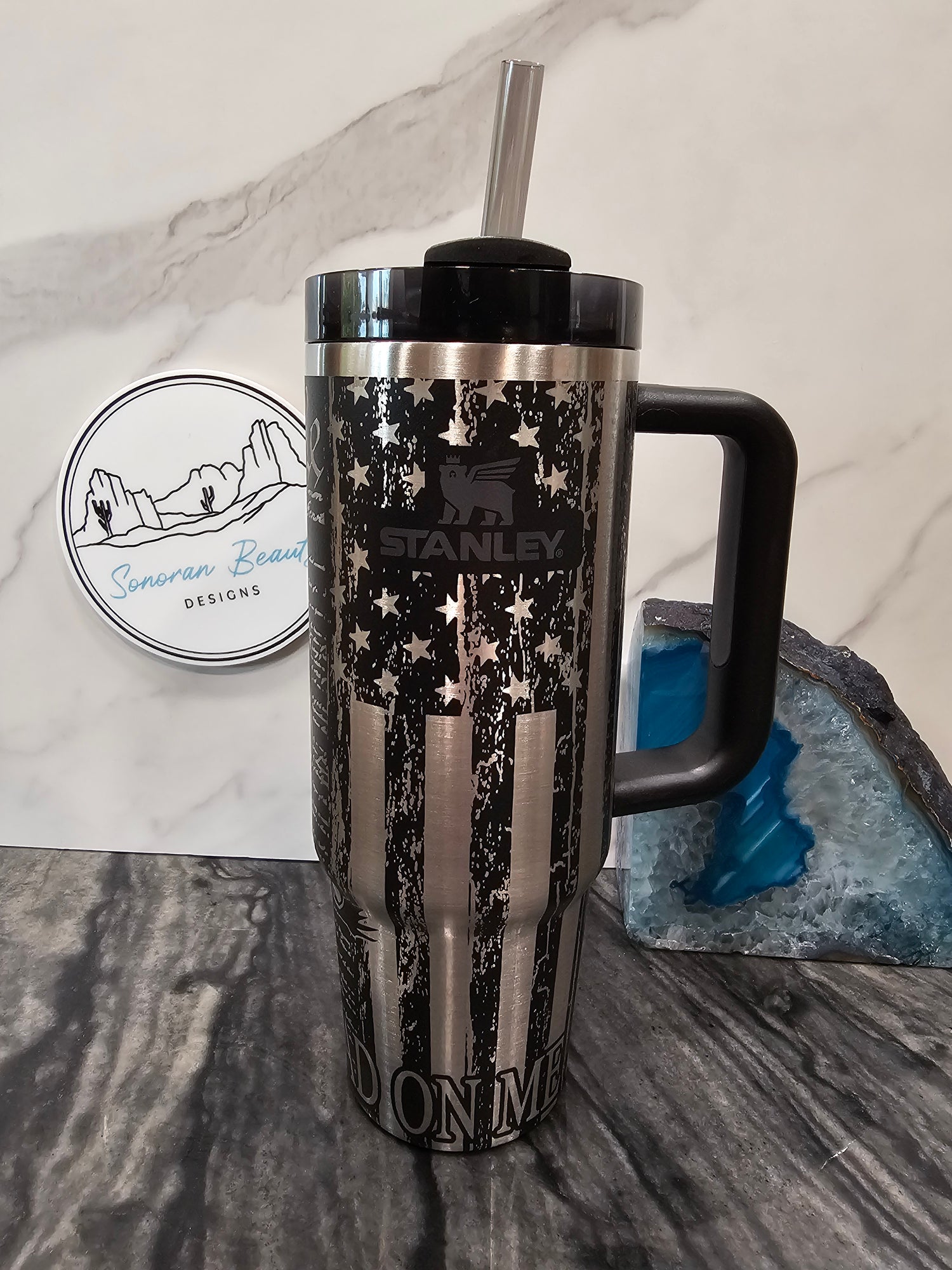 Americana on display. A rugged flag surrounds the Stanley logo top to bottom. The flip side features a "We the People" constitution print, with a large snake and "Don't Tread on Me" around the bottom. Make sure you see both pictures and the video to see the whole cup, as the engraving is a full wrap. This design is by Matt Holms Ducks of 2a3d laser.