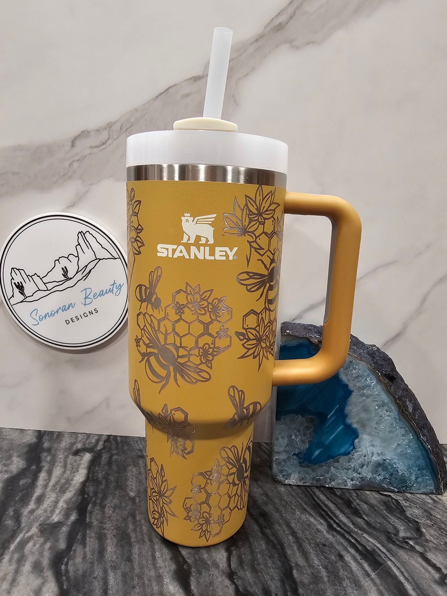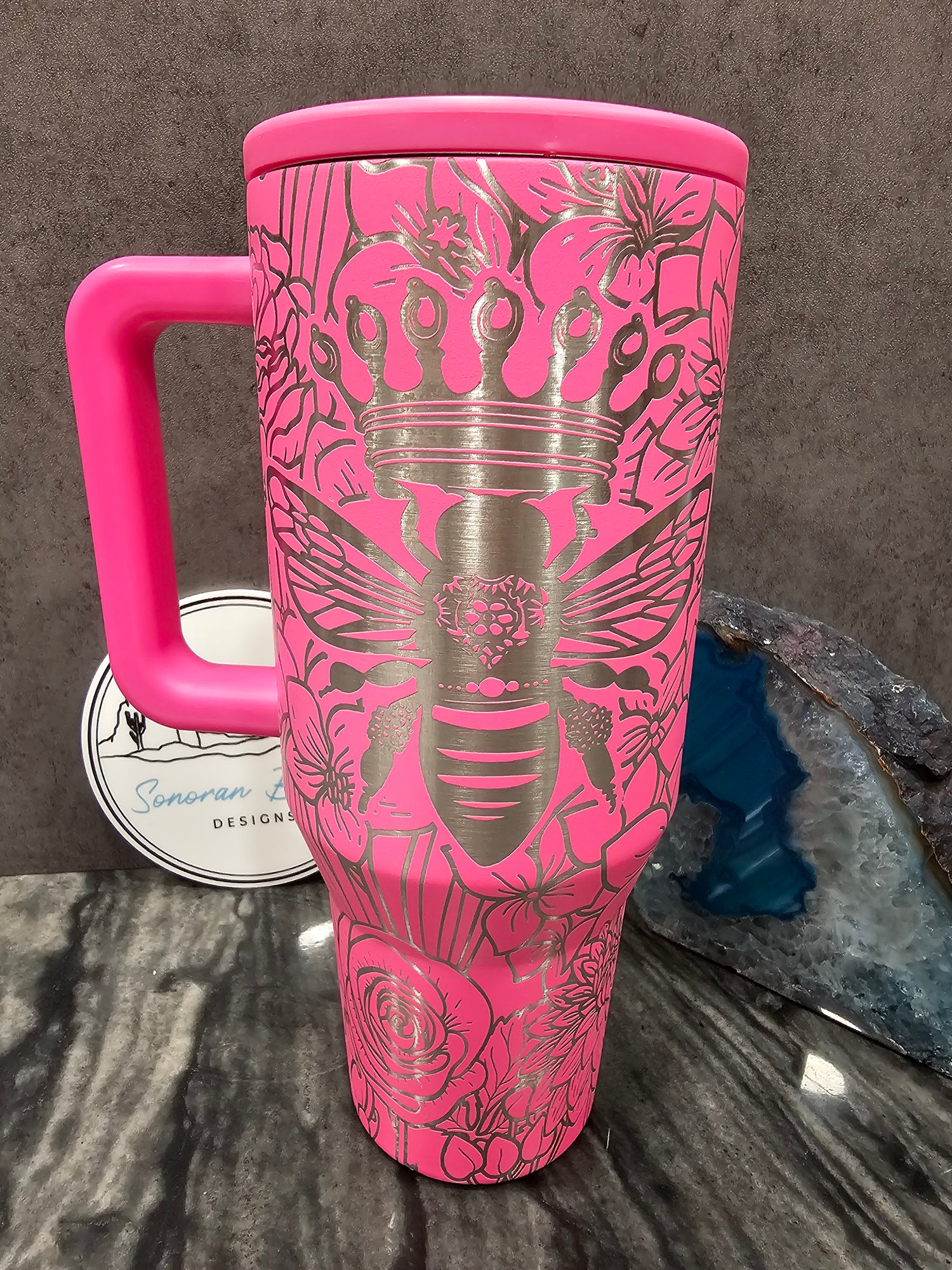 Another Sonoran Beauty designs original by Amanda. The Queen Bee design features an intricate and gorgeous bee with a large crown surrounded by wildflowers. This cup is powerful and beautiful at the same time. Make the statement or simply remind yourself of your queen status.